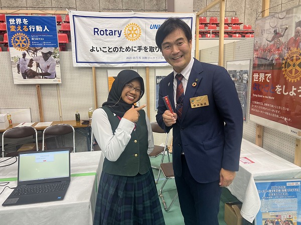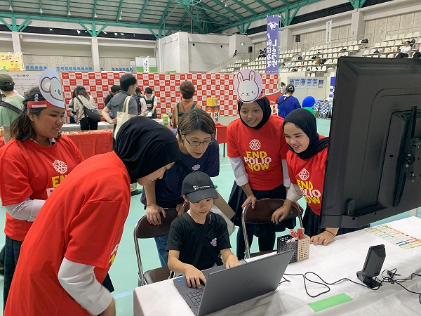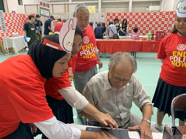 当日は学校法人仙台育英学園 東和蛍雪校舎で学ばれているインドネシア留学生12名にもお手伝いを頂き、AIで作成した「ポリオクイズ」やポリオ撲滅シューティングゲームでロータリーが35年以上取り組んでいるポリオ根絶活動について啓蒙活動を行いました。