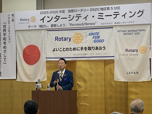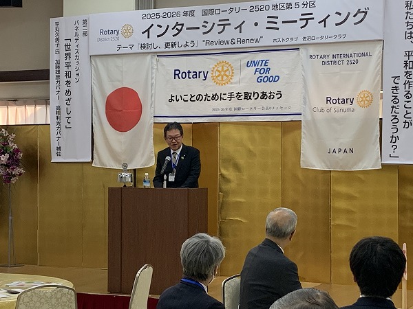 2026年1月17日 / 最終更新日時 : 2026年2月14日 wing 活動報告 インターシティ・ミーティングが開催されました。 2025-2026年度国際ロータリークラブ第2520地区 第5分区インターシティ・ミーティングが開催されました。 日時:2026年1月17(土) 場所:若鮨はさま館 会場受付 歓迎の挨拶 佐沼RC 布施会長 加藤雄彦ガバナー PCP(Peace Cell Project) 代表 平丸久美子氏